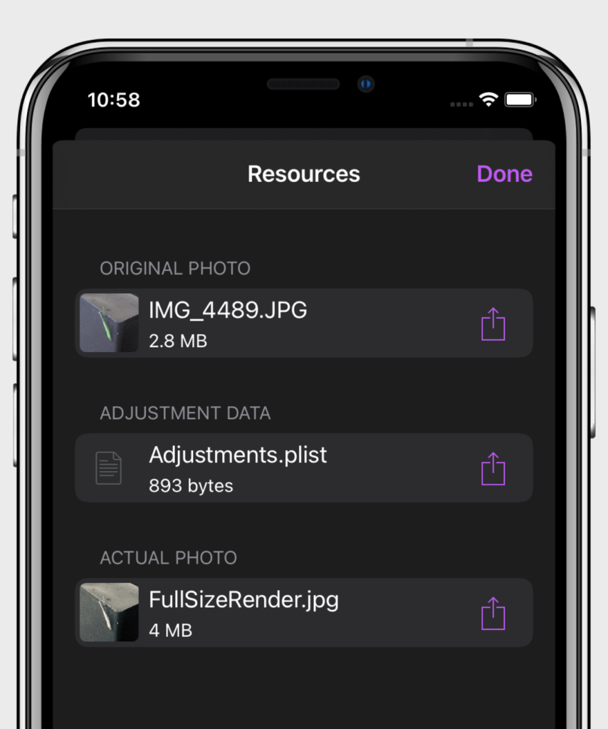 Some improvements to the user interface: avoid to present the “Modify” button when the picture cannot be modified (e.g. photos from Shared Albums). settings and About Views with a grouped style table (starting from iOS 13) small changes at cells with photo preview more space on top of the Details View table