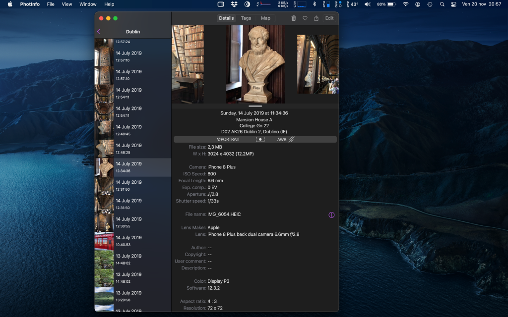 For a few days now PhotInfo is available on the Mac. The app works like on iPhone/iPad: it only accesses the pictures in your Photos Library (the ones you see in the native Photos app). PhotInfo for Mac shows all the tags contained in these images and let you modifying the main ones. The UI is very similar, but it’s not the same: it’s optimized for the Mac. If you buy PhotInfo (or unlock the editing in PhotInfo NG) on one platform you can download the app on the other platforms for free. ...