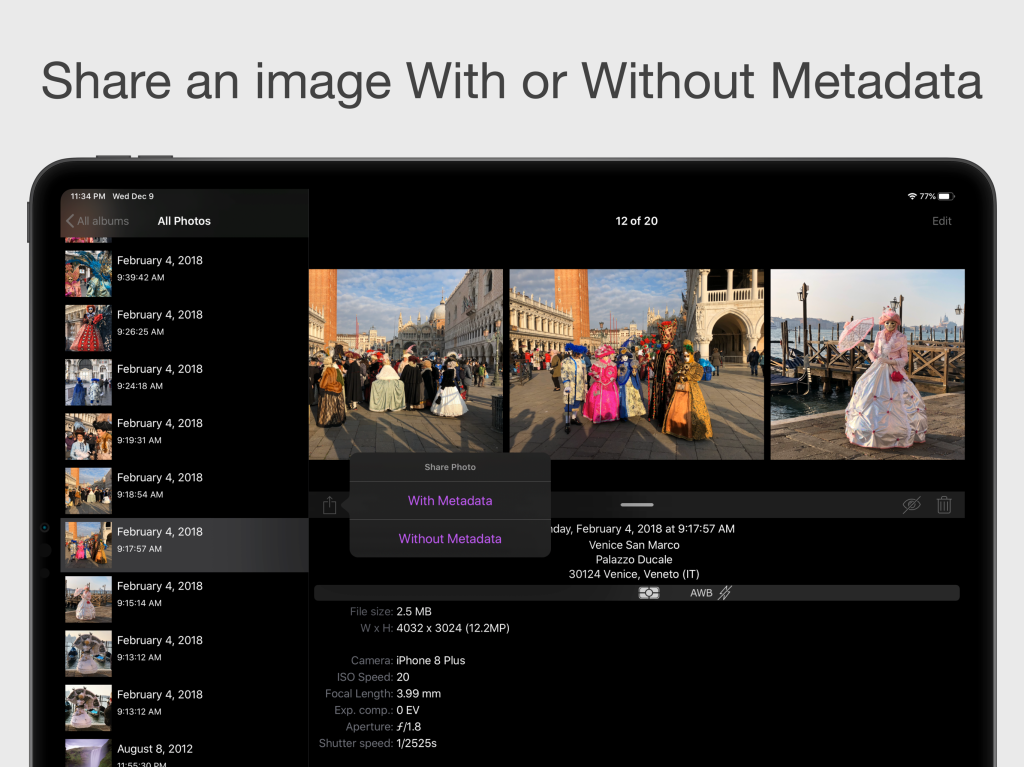 Starting from the new PhotInfo 6.11.0 (and the corresponding 1.01.0 for the Mac) it is possible to share an image with or without its exif tags directly from the toolbar. PhotInfo 6.11.0 Moreover, in this version there are a some small UI changes and fixes: Reduced information density in the table listing photos line by line (not in the grid) “Rate on the App Store” goes directly to the review page (instead that only on the app page in the App Store) fixed a caouple of recent regressions: some wrong theme colors and return to the classic DataPicker in iOS 14